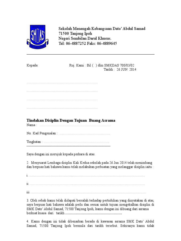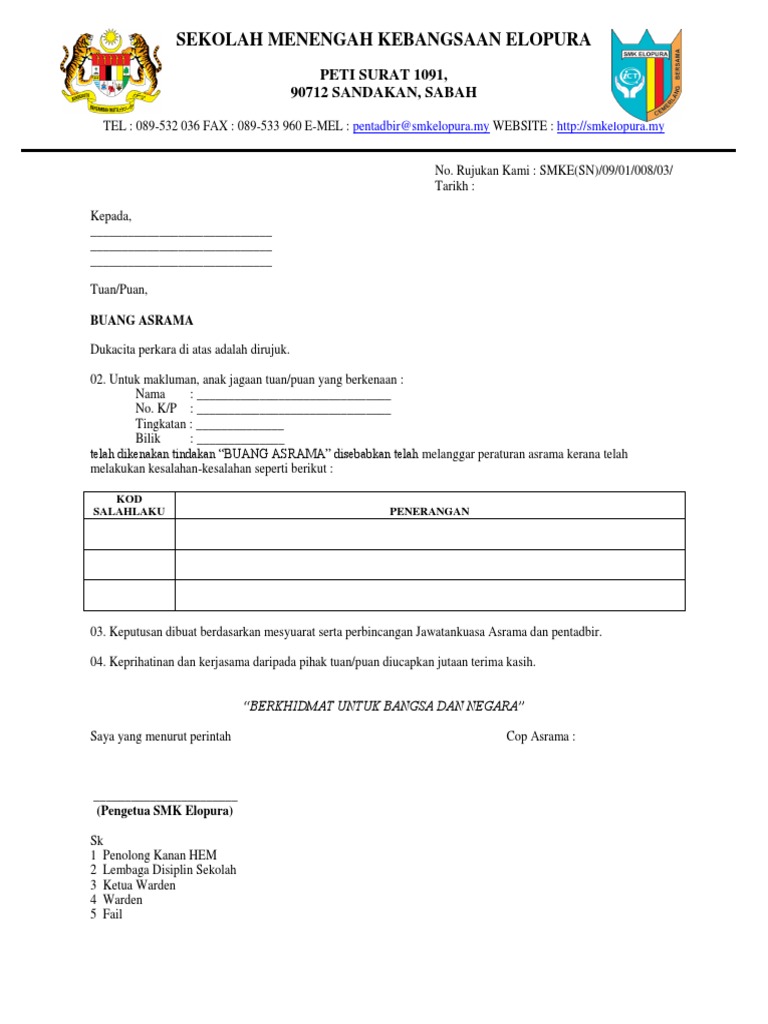 Contoh Surat Buang Asrama